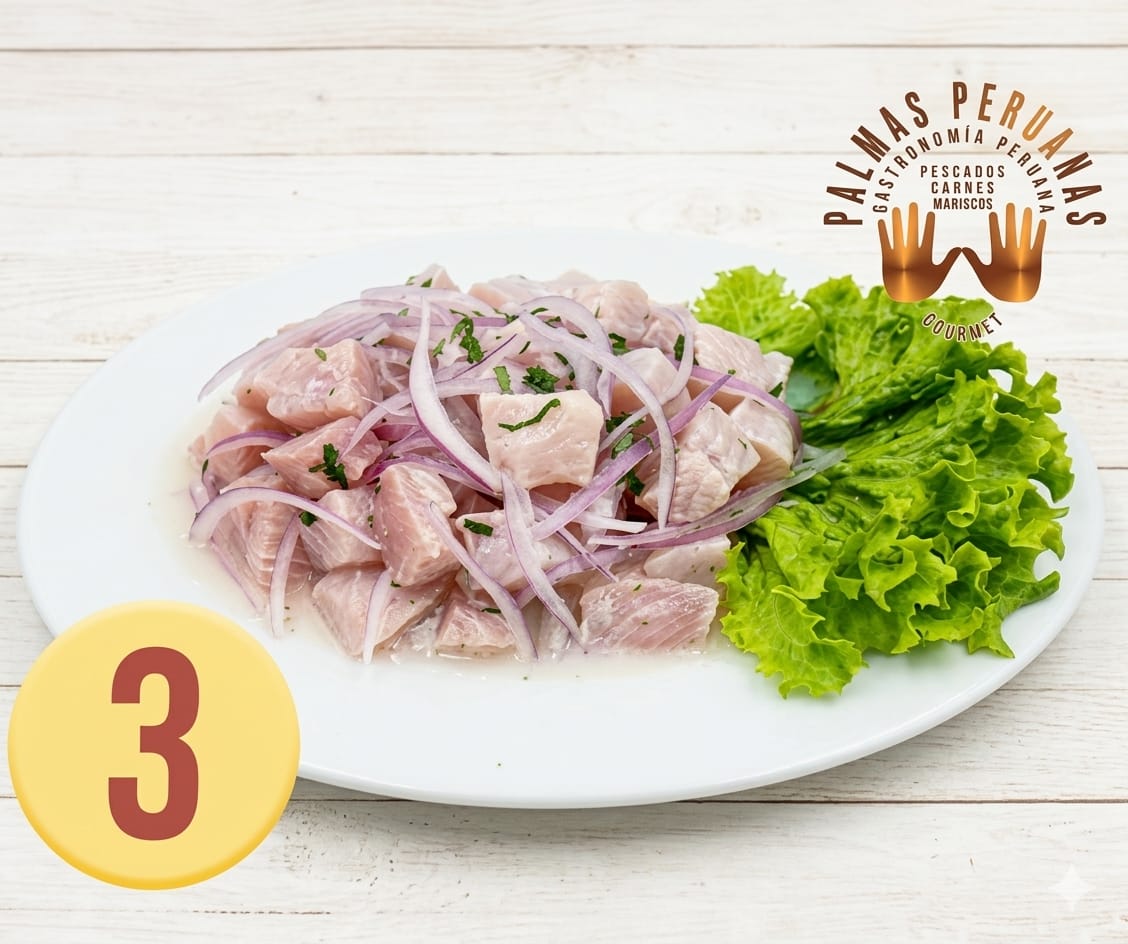 Plato elaborado como ingrediente principal reineta fresca, cortada en trozos slice y marinada en leche de tigre, cebolla morada corte pluma, sal, cilantro fresco y especias peruanas cuidadosamente seleccionadas.