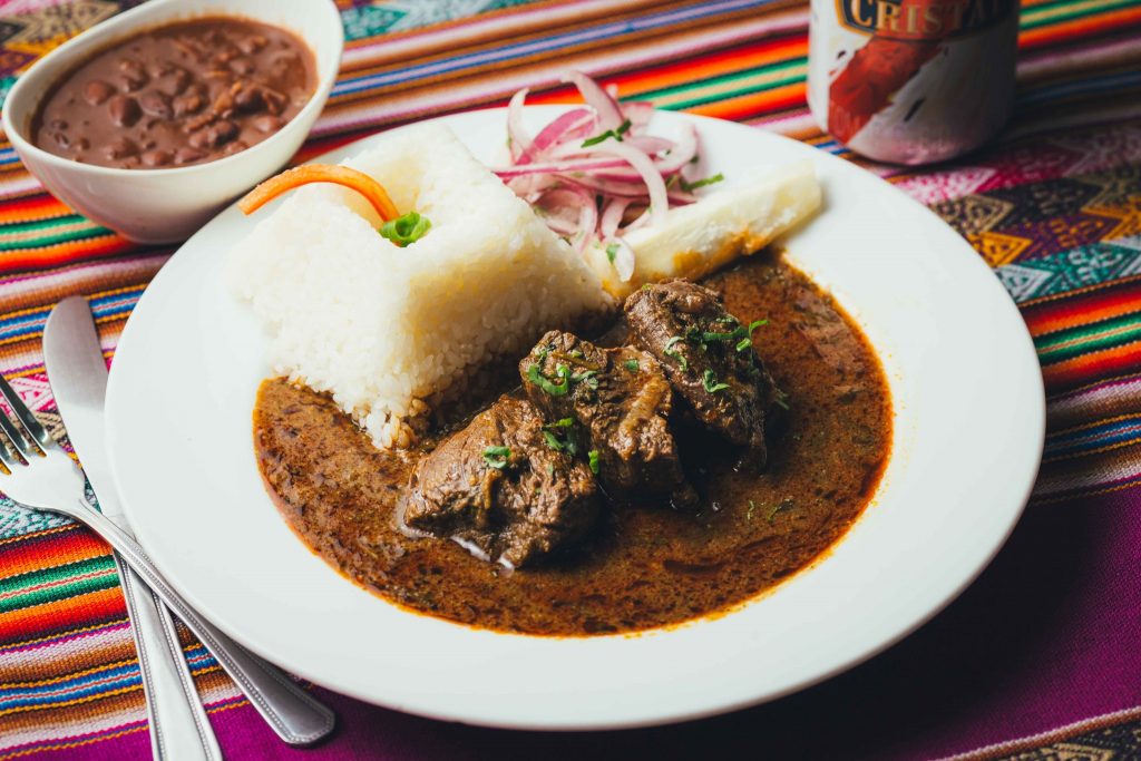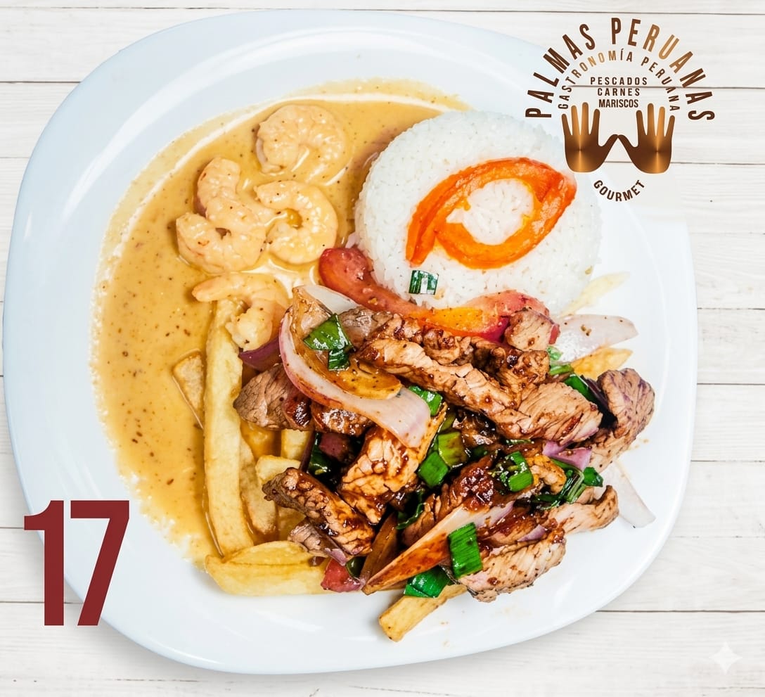 Trozos de filete de vacuno, bañado en una salsa de camarones ecuatorianos, vino blanco, leche, crema de leche y especias peruanas cuidadosamente seleccionadas. Acompañado con una porcion de arroz blanco y papas fritas naturales.