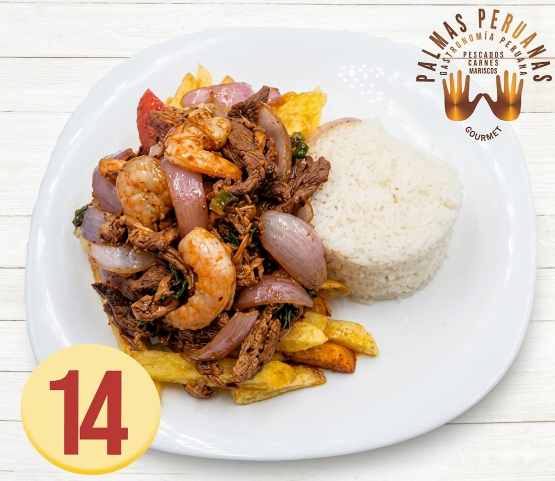 Trozos de filete de vacuno y de pollo, acompañado con camarones ecuatorianos. Flambeado y salteado con cebolla morada, tomates frescos, cebollines y especias peruanas. Acompañado con una porcion de arroz blanco y papas fritas naturales