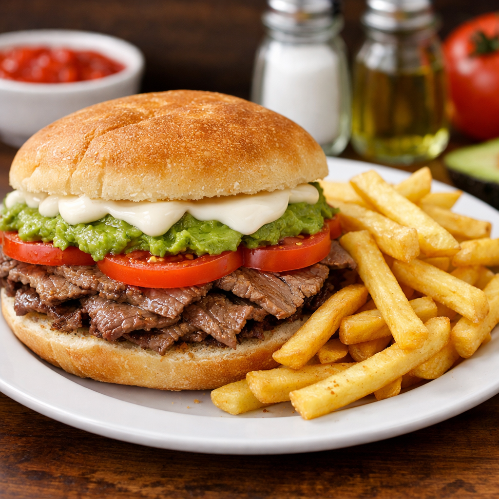 200gr de trozos de filete de vacuno falmbeado y salteado con cebolla morada, tomates frescos, especias peruanas y mayo casera, incluye porción de papas fritas naturales.